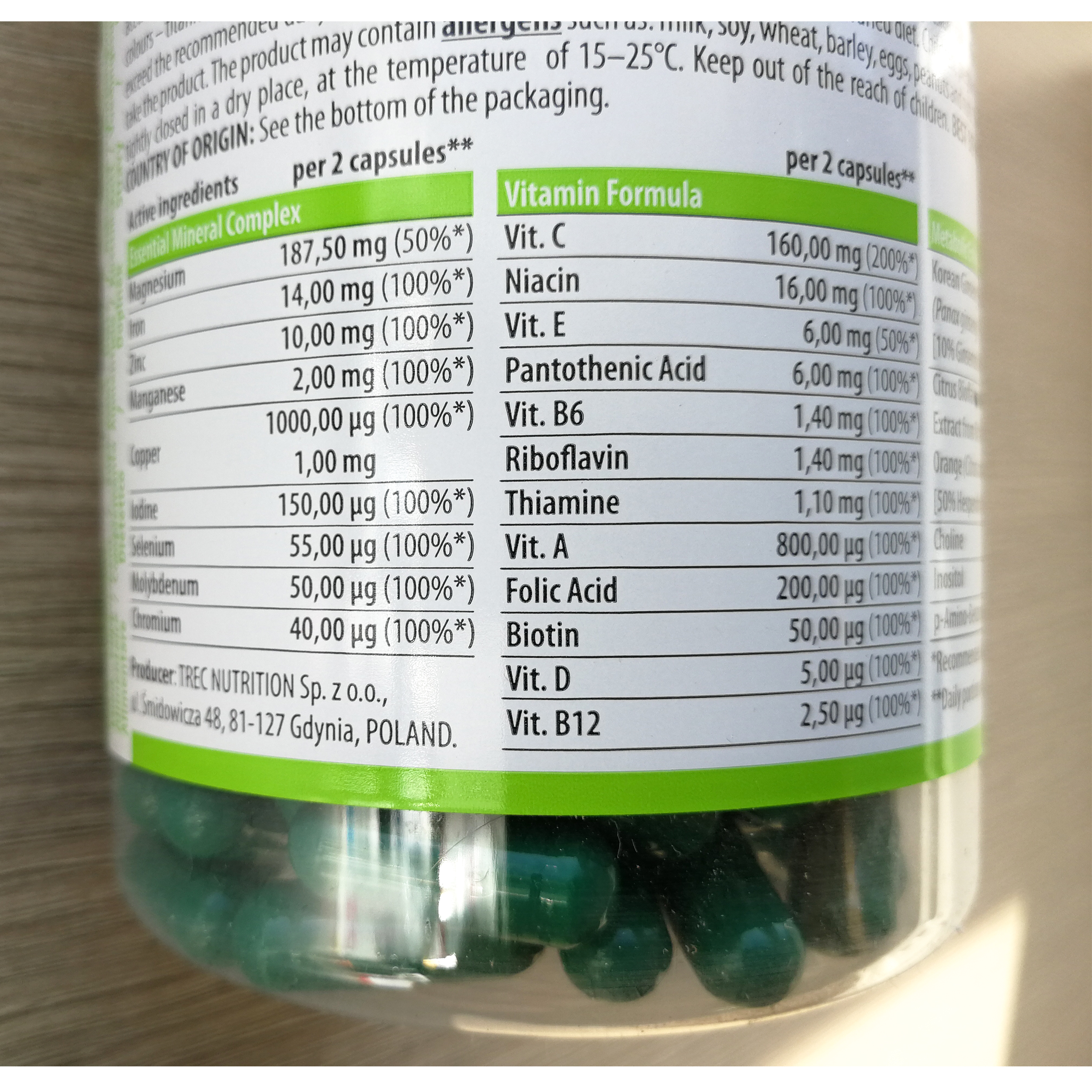 Inhaltsstoffe: Essential Mineral Complex [Magnesiumoxid; Magnesiumcarbonat; Eisenfumarat; Maltodextrin; Zinksulfat; Mangansulfat; Kupfersulfat; Kaliumjodid; Chromchlorid; Natriummolybdat; Natriumselenit]; Metabolic Enhancers [Koreanischer Ginseng Extrakt (Panax ginseng) [10% Ginsenoside]; Zitrus-Bioflavonoid-Extrakt (Citrus aurantium) [50% Hesperidin]; Cholinbitartrat; Inositol; Paraaminobenzoesäure (PABA)]; Vitamin Formula [Vit. C (L-Ascorbinsäure); Niacin (Nikotinsäureamid); Vit E (DL-alpha-Tocopherol); Pantothensäure (Calciumpantothenat); Vit. B6 (Pyridoxinhydrochlorid); Vit. B2 (Riboflavin); Vit. B1 (Thiaminmononitrat); Vit. A (Retinylacetat); Folsäure (Pteroilmonoglutaminsäure); Biotin (D-Biotin); Vit. B12 (Cyanocobalamin); Kapselhülle (Gelatine; Farbstoffe – Titandioxid, Eisenoxide und -hydroxide, Patent Blue V); Rieselhilfe – Magnesiumsalze von Speisefettsäuren.