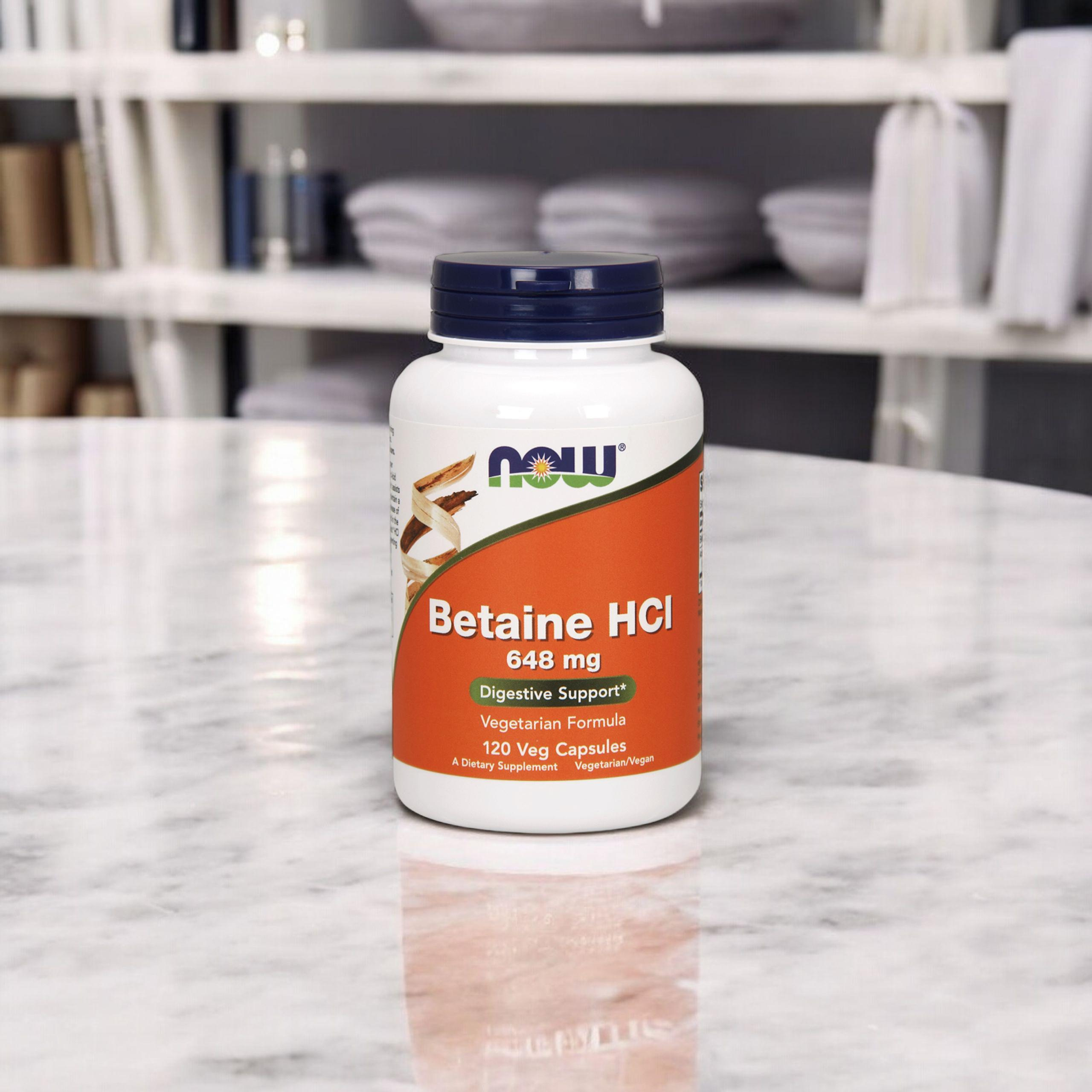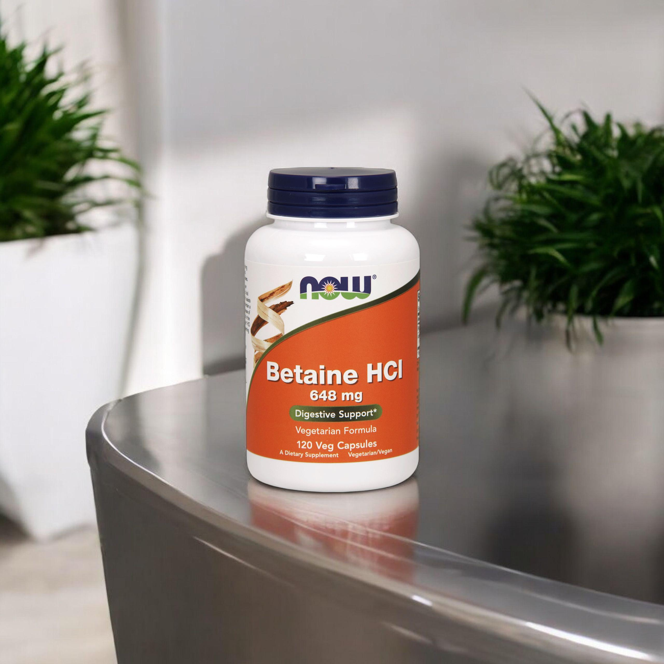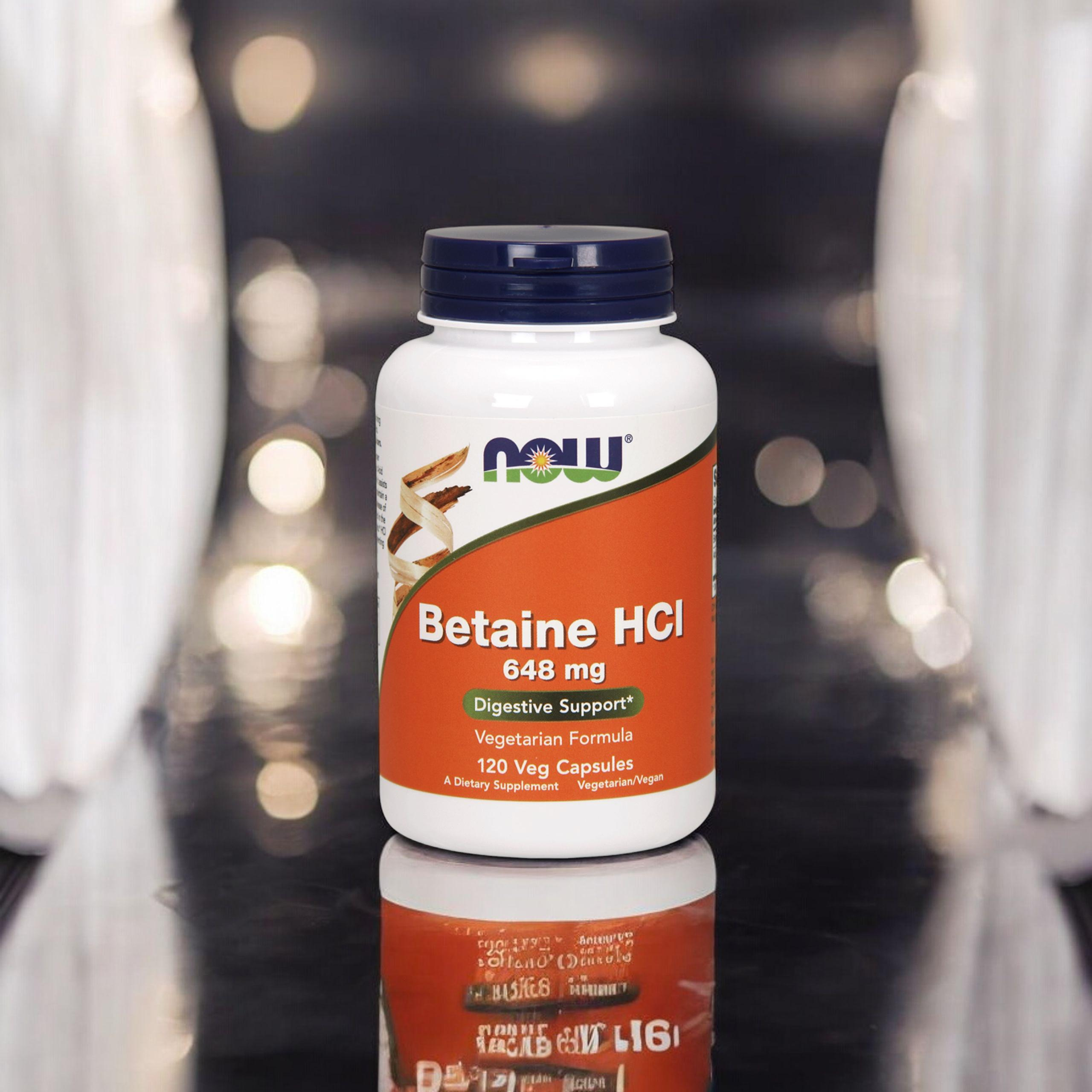 - Betaine HCI 648mg von NOW ist ein Nahrungsergänzungsmittel, das dazu beiträgt, einen normalen Homocystein-Stoffwechsel aufrechtzuerhalten. Das Produkt ist in Kapseln verpackt, die für Vegetarier und Veganer geeignet sind. Die Packung enthält 120 vegane Ka