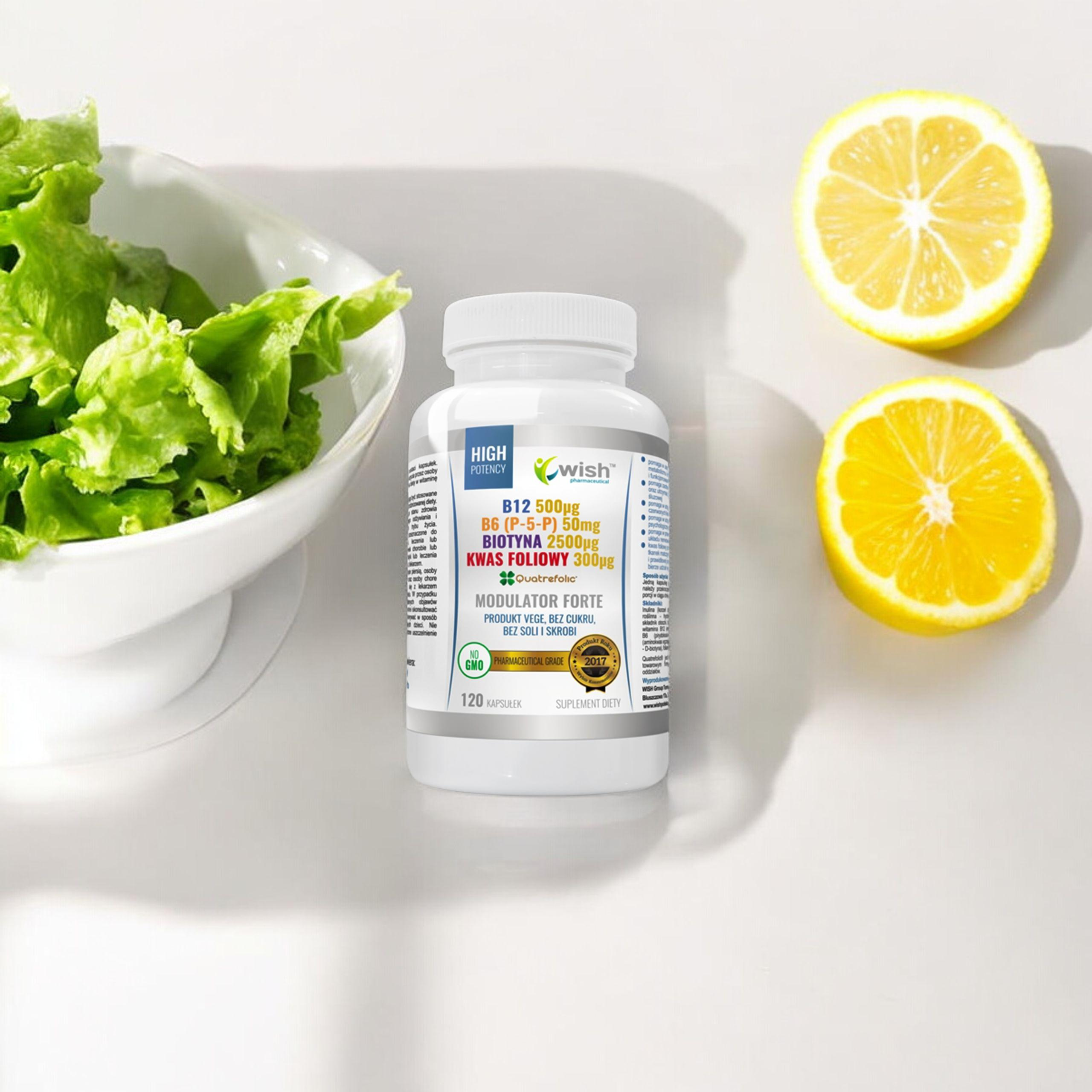 • Supplement von der Firma Wish, Modulator Forte enthält bis zu 120 Kapseln, die von Personen verwendet werden können, die keine tierischen Produkte konsumieren. Das Produkt enthält einen Komplex von B-Vitaminen, darunter: Biotin, B6, B12, oder Folsäure.