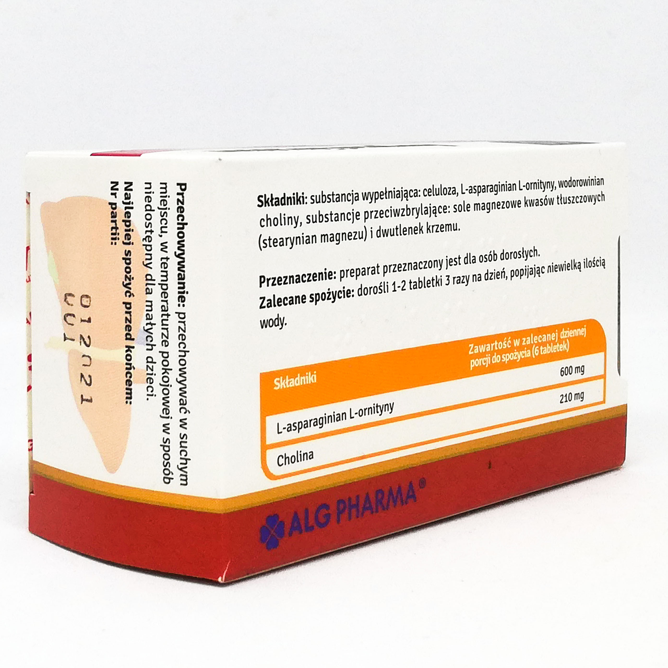 Inhaltsstoffe: Füllstoff: Cellulose, L-Asparaginat L-Ornithin, Cholinbitartrat, Trennmittel: Magnesiumsalze der Speisefettsäuren (Magnesiumstearat) und Siliciumdioxid, Überzugmittel: Hydroxypropylmethylcellulose, Füllstoff: Polydextrose, Farbstoff: Titandioxid, Überzugmittel: Polyethylenglykol, Trennmittel: Talkum.