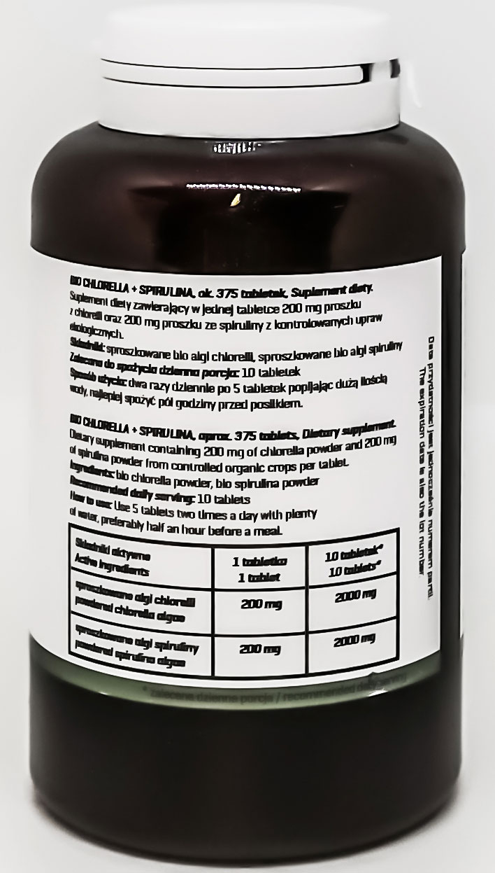 - Bio - Chlorella + Spirulina 1:1 ist ein Supplement mit hohem Anteil an pulverisierten Bio-Algen Spirulina und Chlorella, die unter anderem Chlorophyll liefern. Unterstützt die Immunität, erleichtert die Entfernung von Toxinen aus dem Körper, verbessert Vi