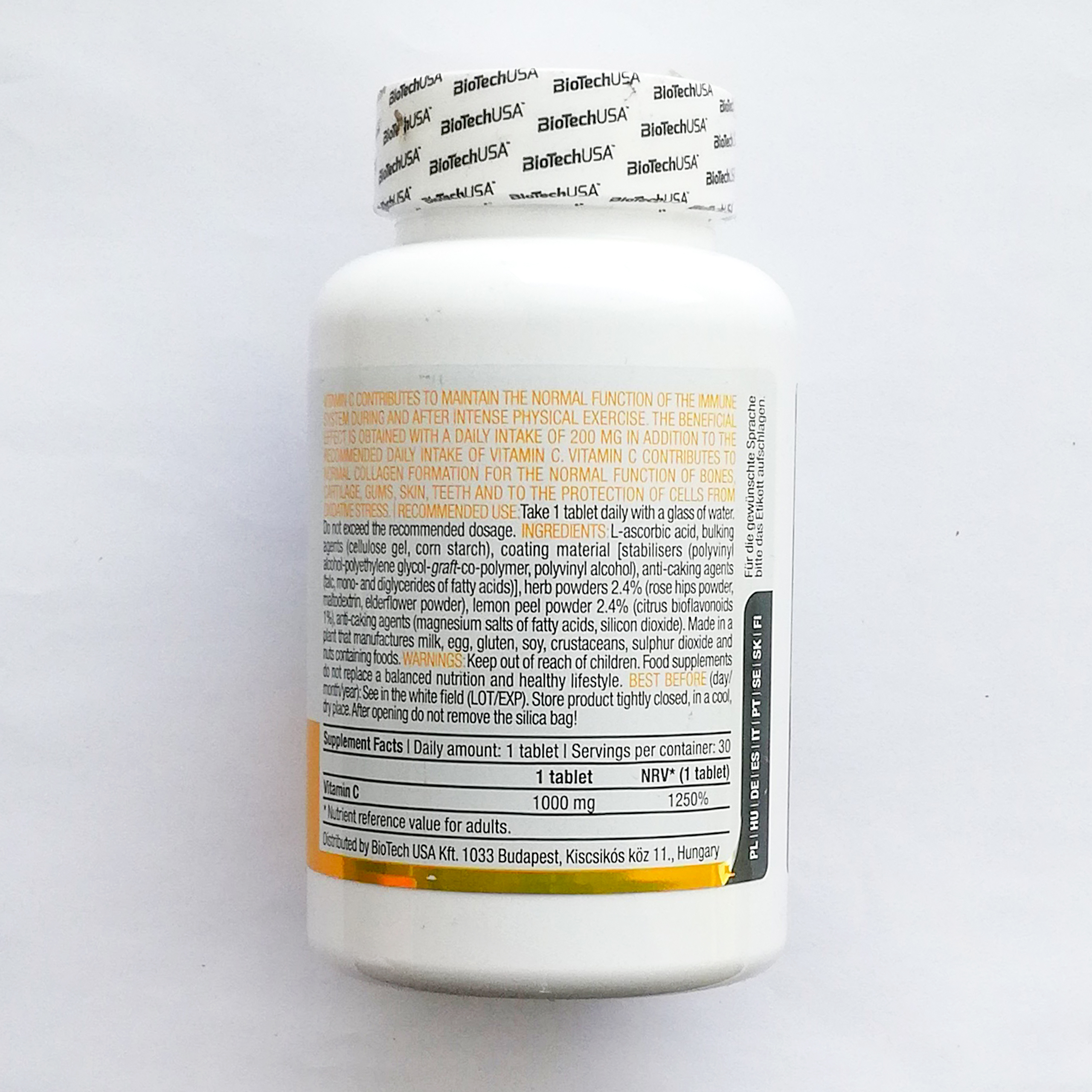 - Vitamin C 1000 der Marke Biotech ist ein Nahrungsergänzungsmittel mit der höchsten Dosis an L-Ascorbinsäure, nämlich 1000 mg. Es wurde mit starken Antioxidantien wie Hagebuttenextrakt, Holunder und Zitronenschale angereichert. Vitamin C ist unverzichtbar