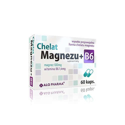 - Chelat Magnezu + B6 ist ein Nahrungsergänzungsmittel von ALG Pharma, das die richtige Funktion des Nerven- und Muskelsystems unterstützt und die psychologischen Funktionen verbessert. Es enthält eine hoch assimilierbare Form von Magnesiumchelaten, angerei