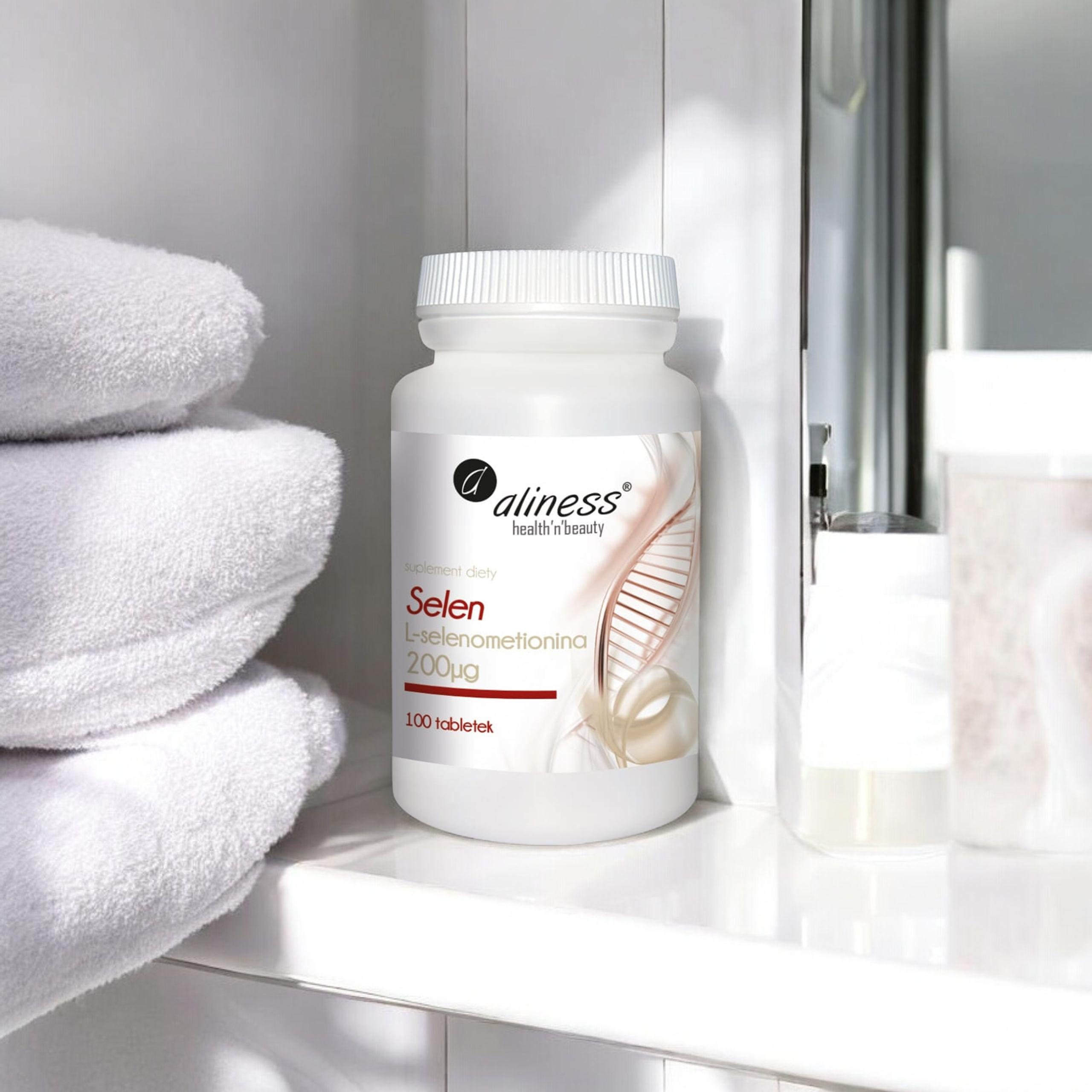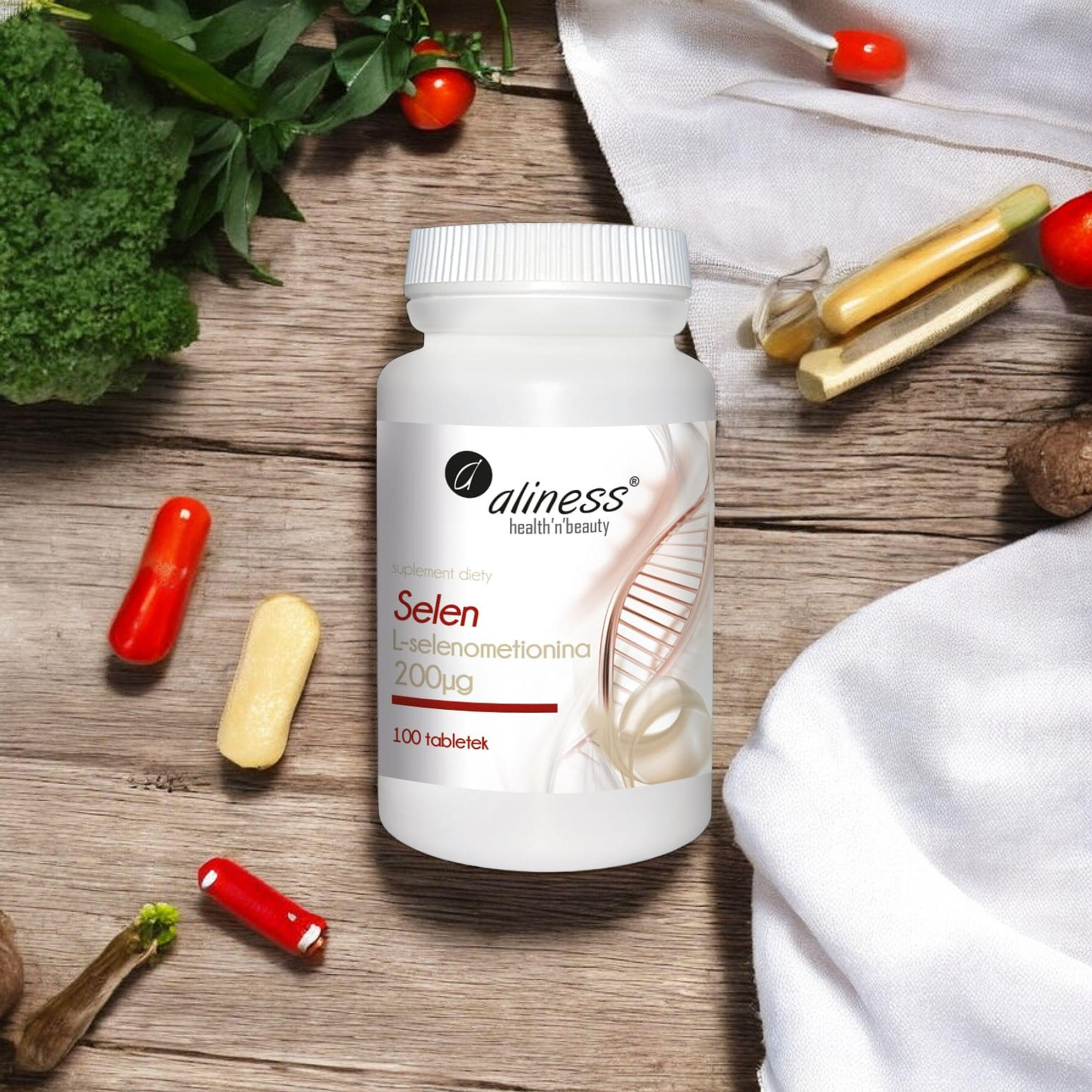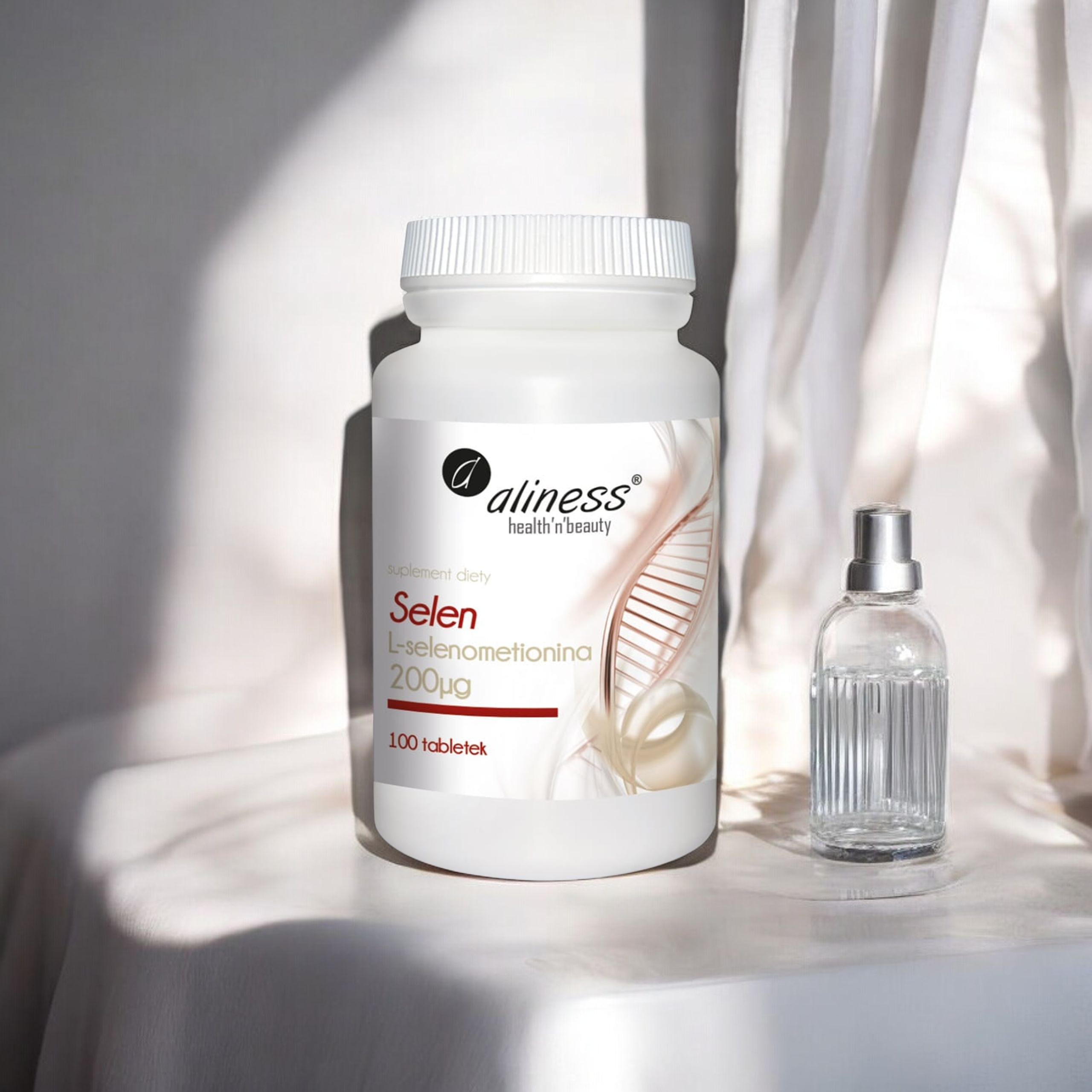 Selen ist ein Spurenelement, das in mehreren Formen vorkommt, sowohl anorganisch (Natriumselenit, Natriumselenat) als auch organisch (L-Selenomethionin, Methylselenocystein und mit Selen angereicherte Hefe). Instinktiv greifen wir in der Regel zu organischen Präparaten, da wir sie für natürlicher halten, aber in diesem Fall können wir noch einen Schritt weiter gehen. Aliness bietet ein Nahrungsergänzungsmittel mit einer patentierten Formel des Minerals an, die von allen Varianten am größten ist Bioverfügbarkeit aufweist, was bedeutet, dass es die am besten assimilierbare und vom Körper verwendete Form ist. L-Selenomethionin bietet nicht nur durch Studien bestätigte bessere Spiegel des Spurenelements im Blutserum, sondern garantiert auch die höchste Sicherheit der Anwendung. Die Tabletten verdanken diese Eigenschaft der Anwesenheit von Methionin – einer Aminosäure, die einen sicheren Stoffwechsel von Selen im Körper gewährleistet. Darüber hinaus enthält das Präparat keine Allergene, Soja, Laktose und Gluten sowie unnötige Zusätze.