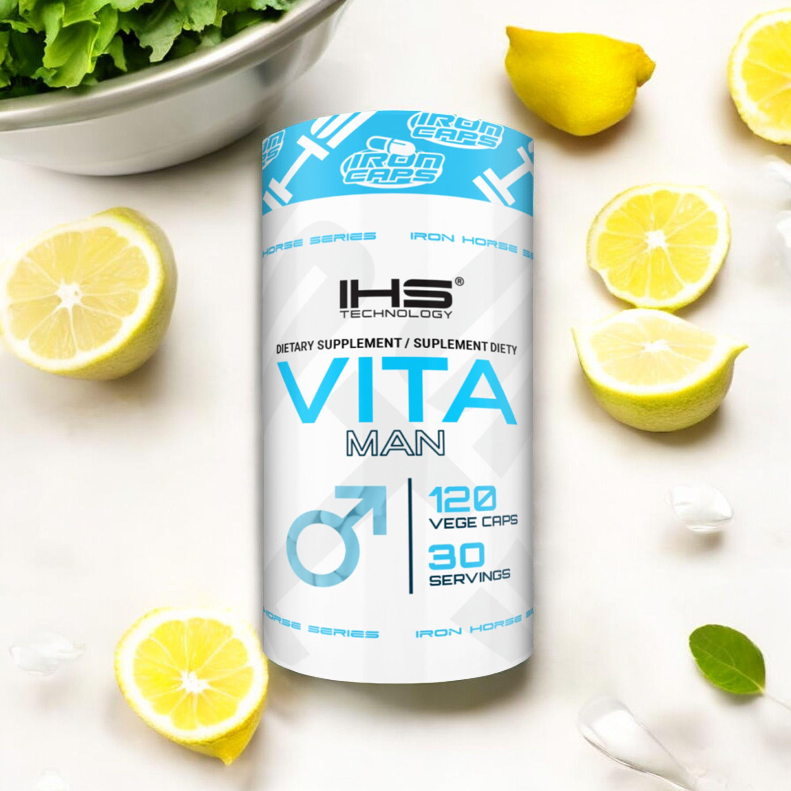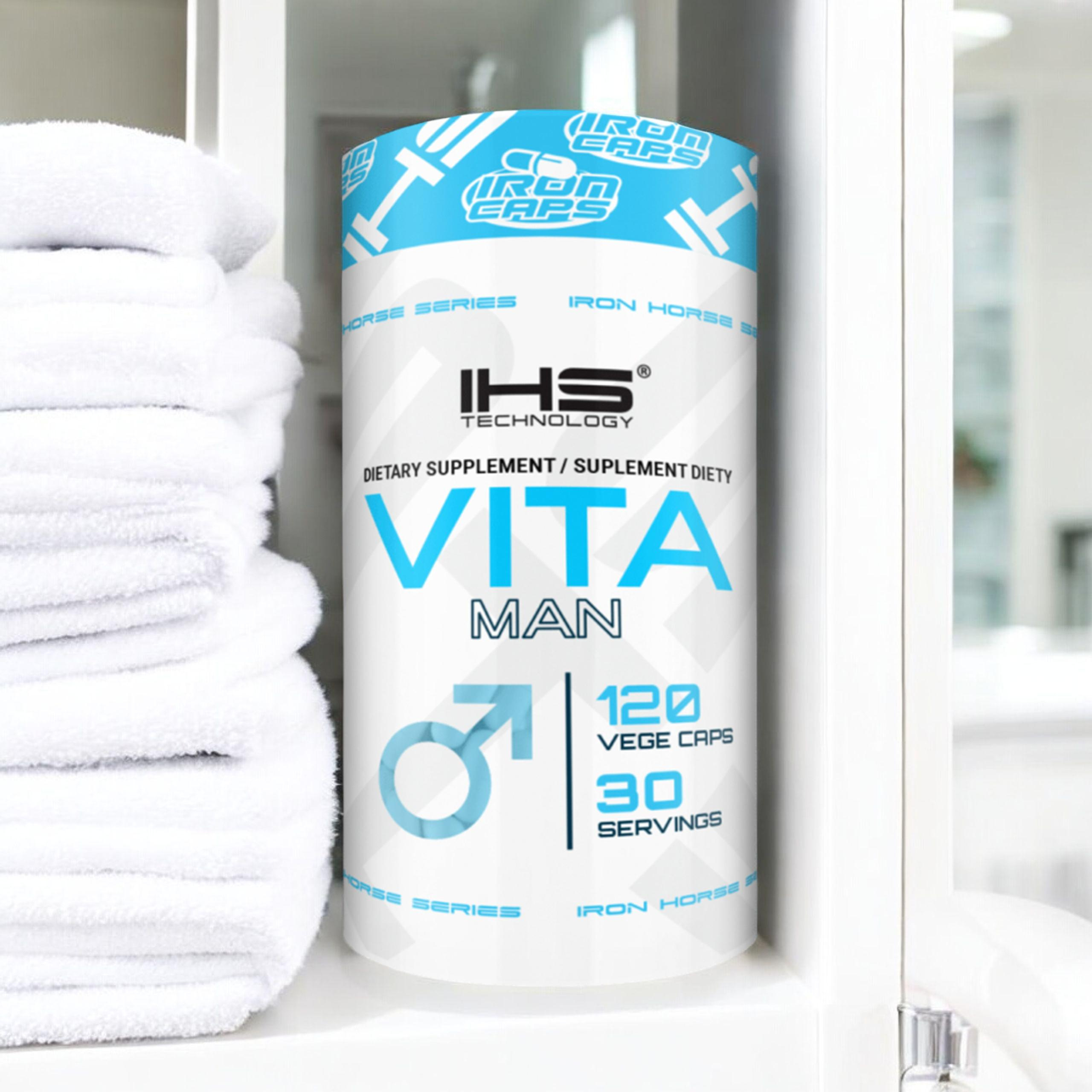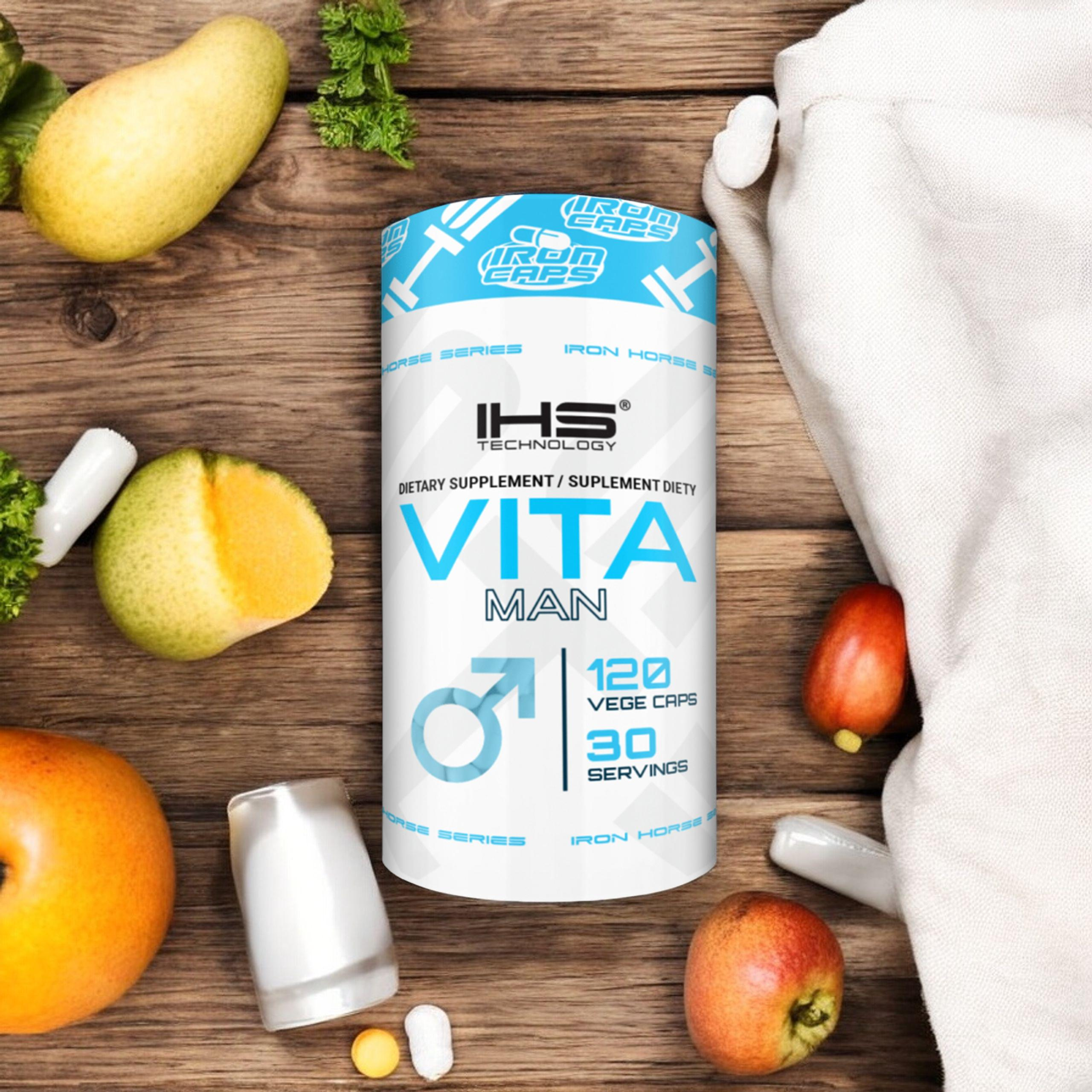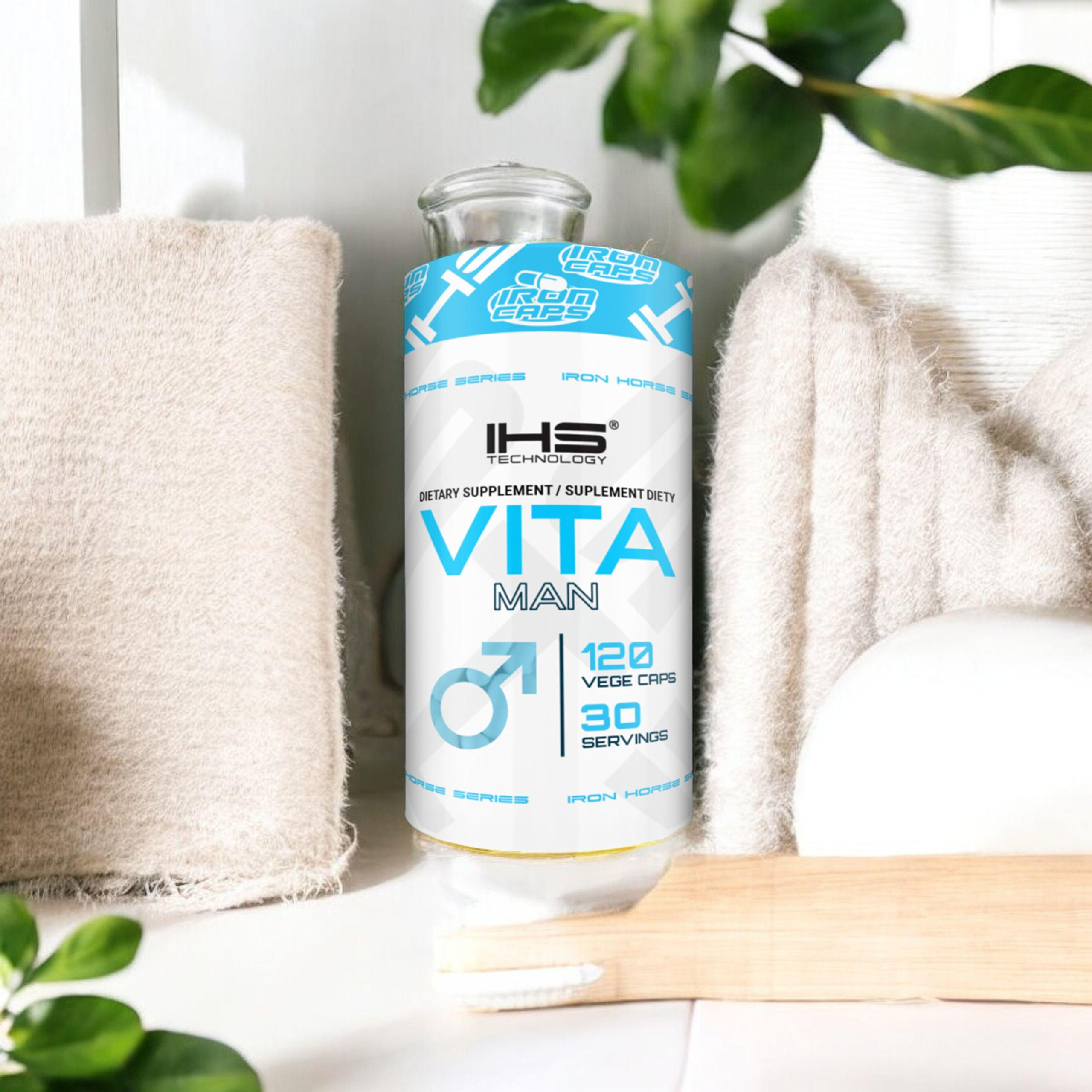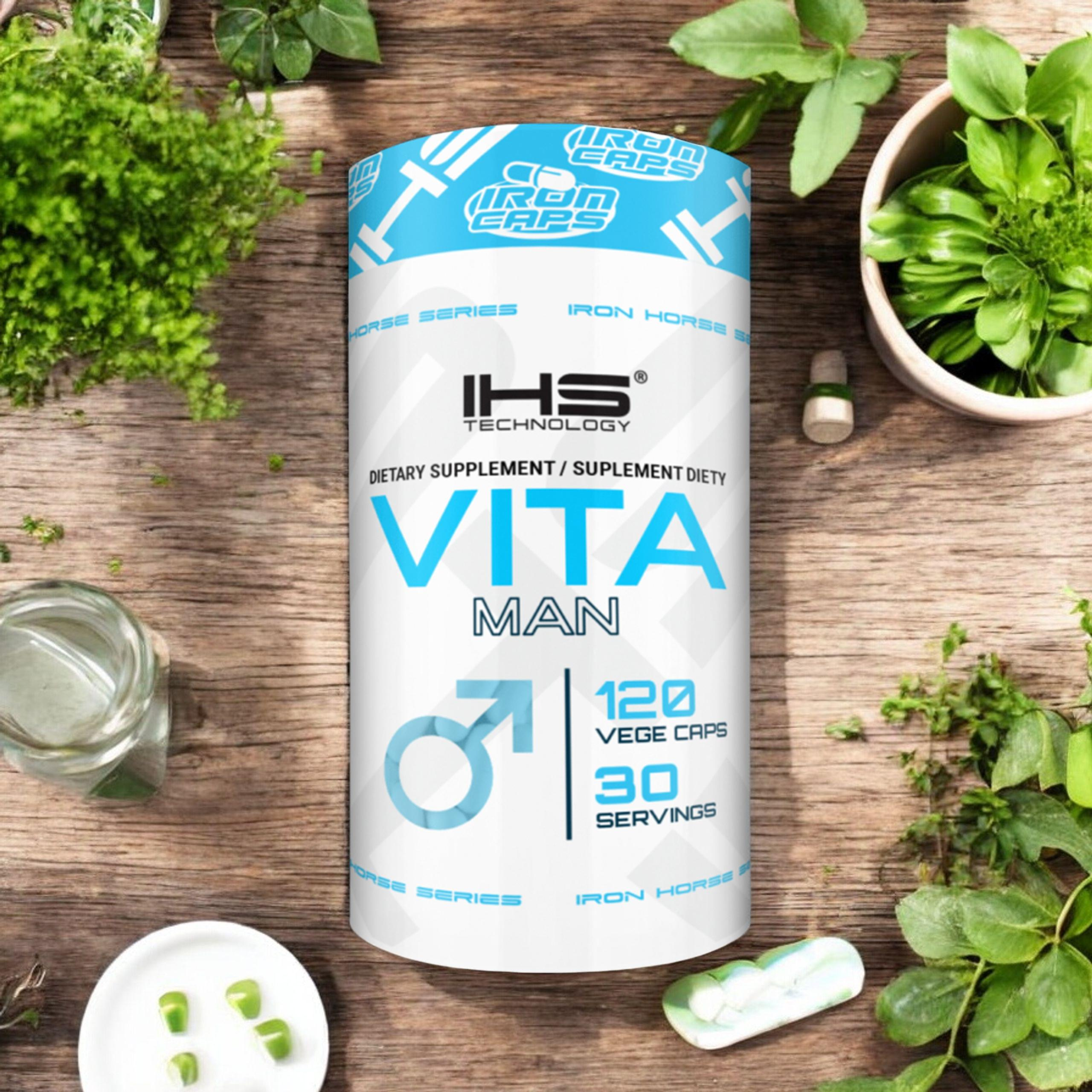 - Vita Man der Marke Iron Horse Series ist ein umfassendes Supplement für Männer, das 30 Schlüsselinhaltsstoffe enthält. Unterstützt Energie, Konzentration, Immunität und allgemeine Vitalität. 120 vegetarische Kapseln.