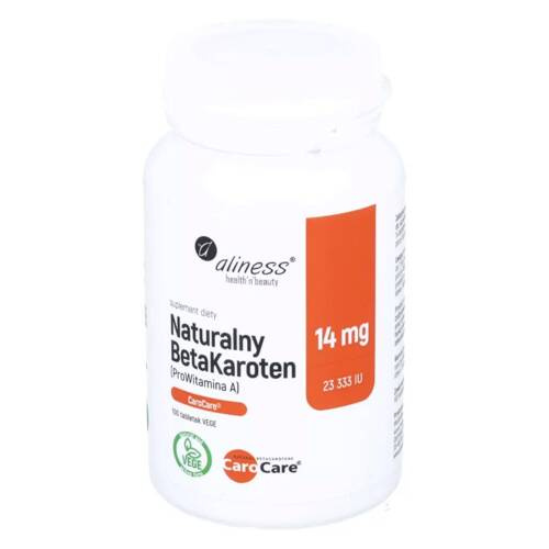 ALINESS Natürlicher BetaCarotin 14mg ist ein Nahrungsergänzungsmittel, das Ihrem Körper eine starke Dosis natürlichen Beta-Carotins CaroCare® liefert. Jede Tablette ist ein Schatz von 75 mg Beta-Carotin, was 15 mg (25 000 IE) reinem Beta-Carotin entspricht. Das sind ganze 300% der Referenzmenge an Vitamin A! Das Produkt ist in Form von praktischen vegetarischen Tabletten erhältlich und ist ideal für die tägliche Nahrungsergänzung für diejenigen, die sich um ihre Gesundheit und ihr Wohlbefinden kümmern.