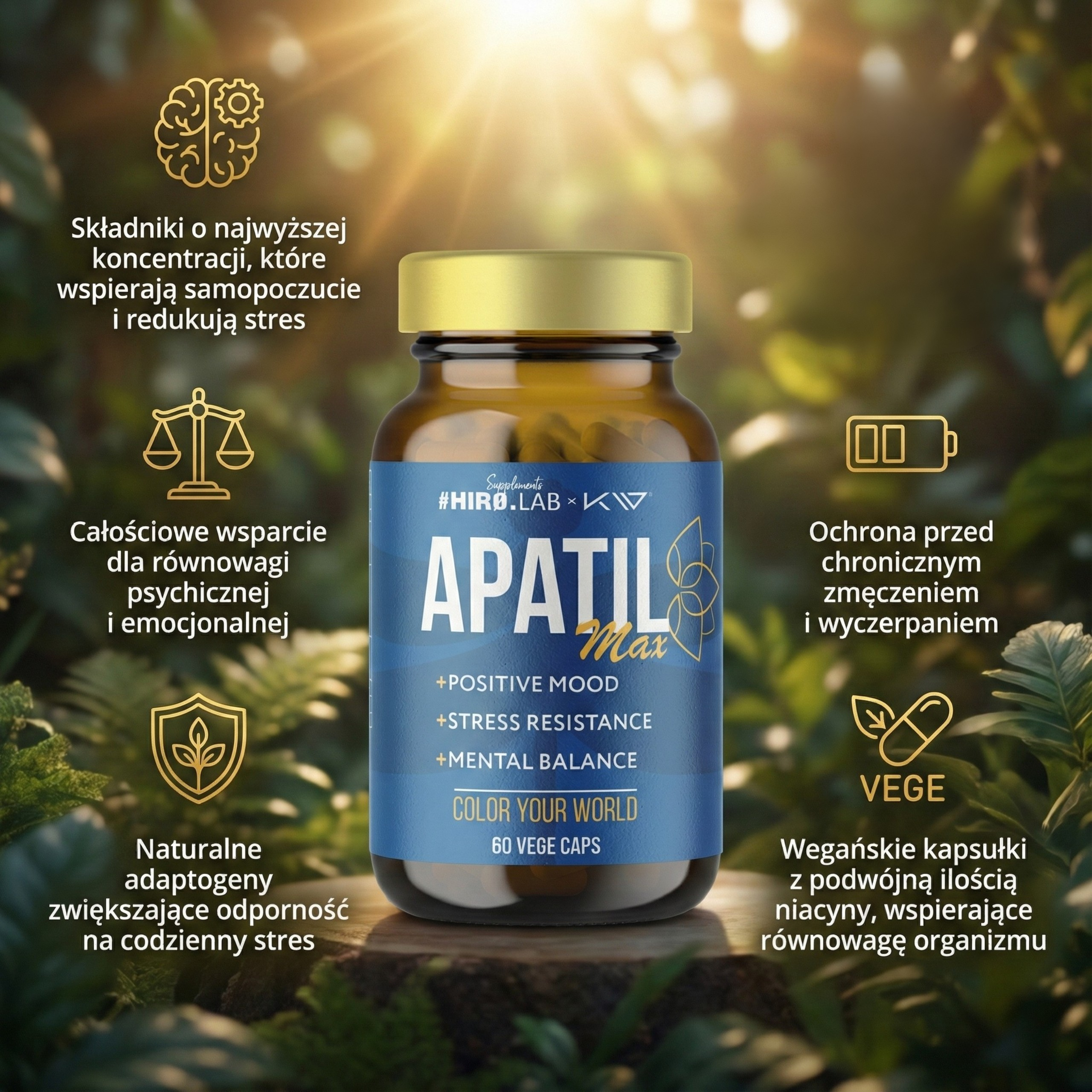 Apatil Max von Hiro.Lab by Kamila Wybrańczyk ist eine stärkere Version des beliebten Apatil, entwickelt für Personen, die größere Unterstützung im täglichen Leben benötigen. Dieses Supplement ist die ideale Wahl für diejenigen, die mit hohem Stress kämpfen und effektive Methoden zur Verbesserung des Wohlbefindens und zur Stärkung der emotionalen Widerstandskraft suchen. Dank der doppelten Dosis Niacin und sorgfältig ausgewählten Zutaten wie Safran, Ashwagandha und Ginseng, hilft Apatil Max innere Ruhe zu finden und die Energie zurückzugewinnen, die gut gerüstet sind, um den täglichen Herausforderungen zu begegnen. Es ist die perfekte Wahl für Menschen, die stärker, ausgeglichener und widerstandsfähiger gegen den Stress des täglichen Lebens sein möchten.