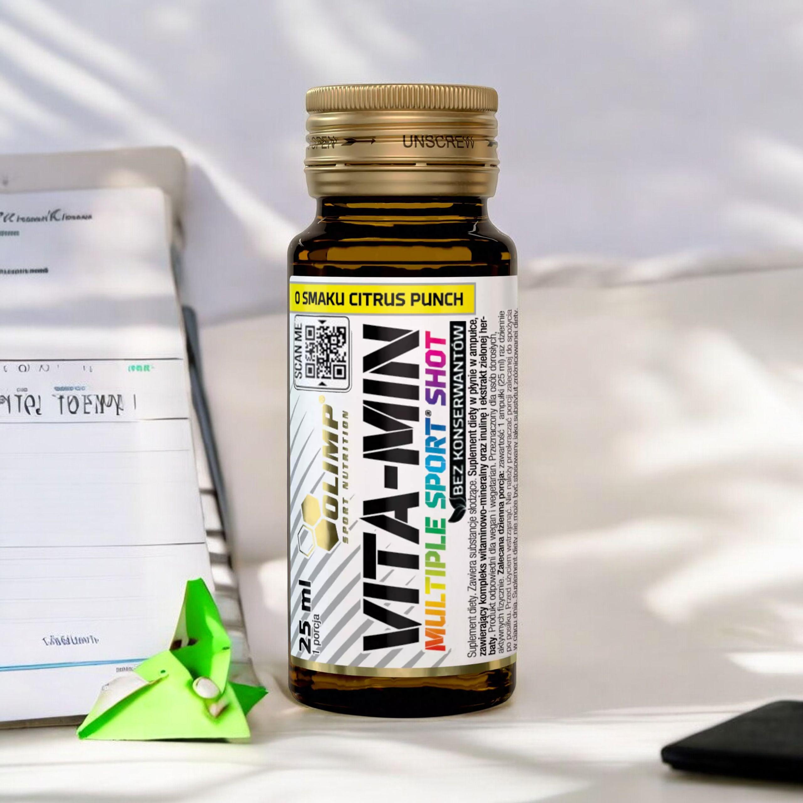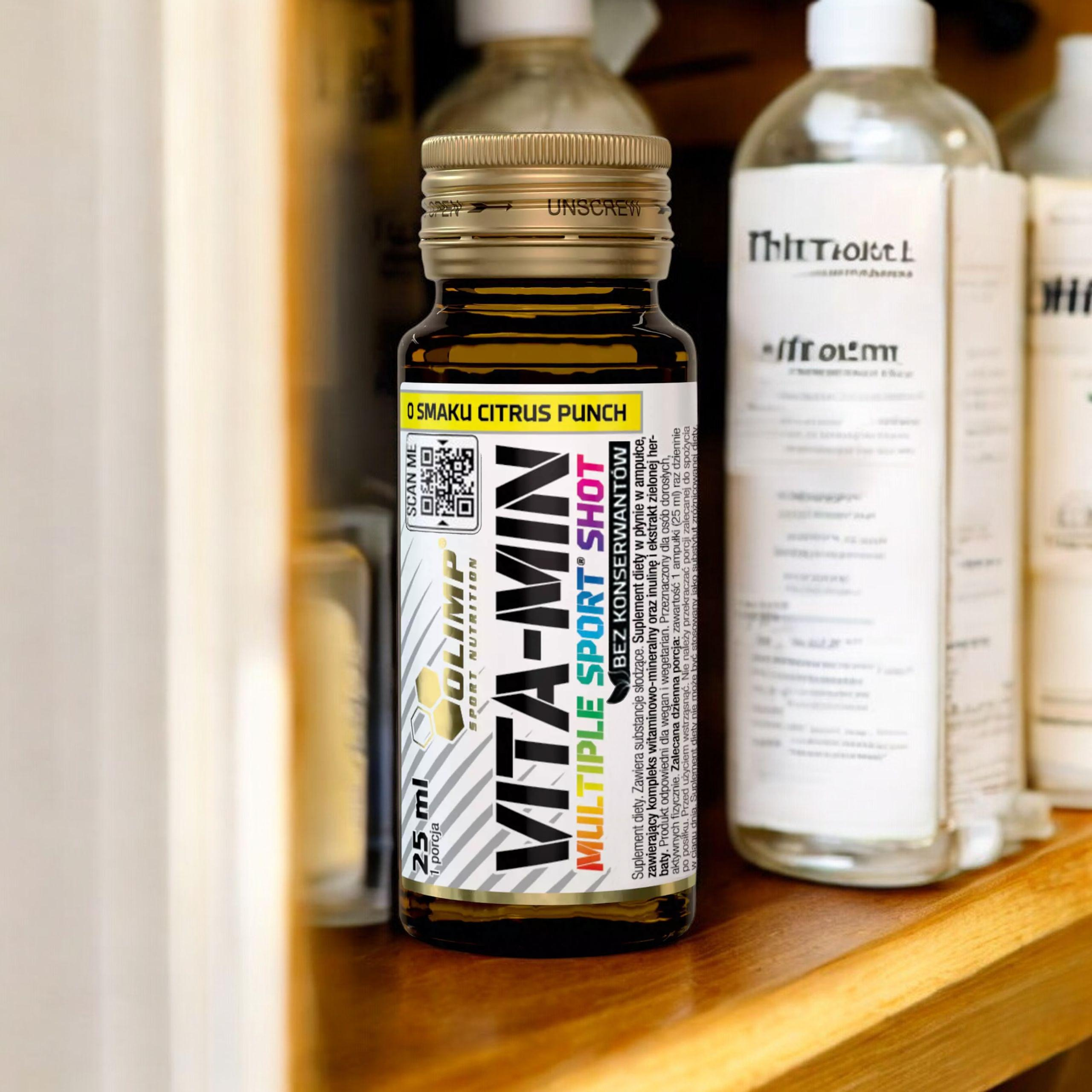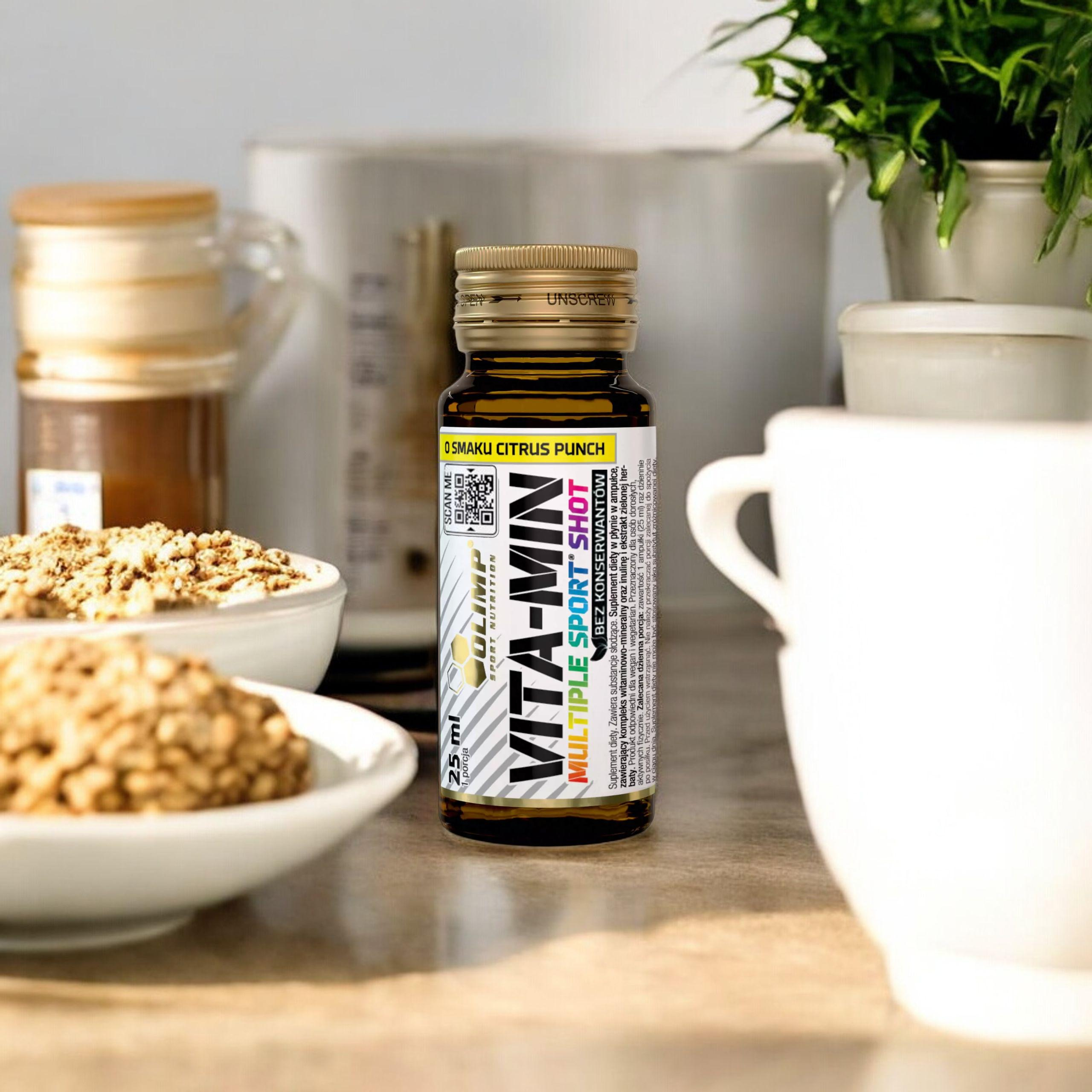 - Vita-Min Multiple Sport Shot enthält alle Vitamine und Mineralien, die ein aktiver Körper benötigt. Genießen Sie Ihre Lieblingstrainings und bleiben Sie voll leistungsfähig mit dem Vitamin-Mineral-Komplex in praktischer Shot-Form von Olimp.