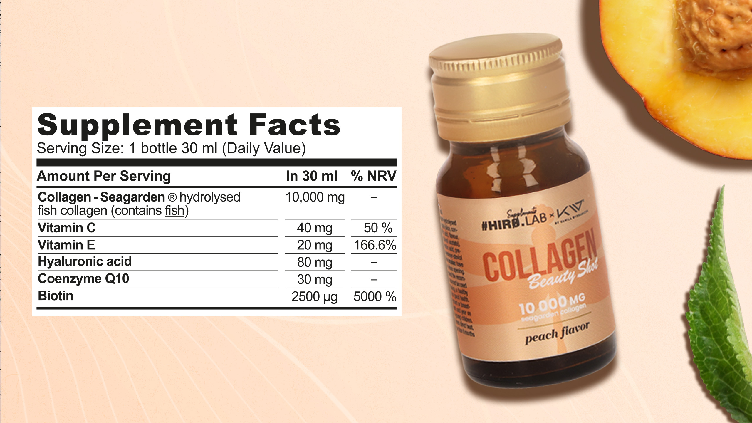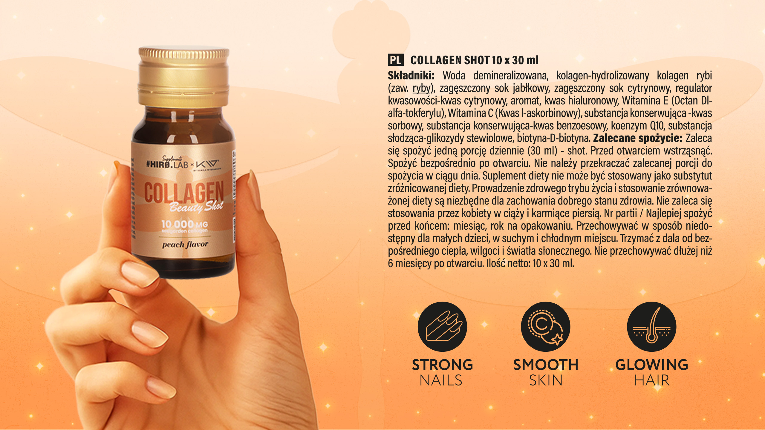 Bei HIRO.LAB setzen wir auf Qualität und Bioverfügbarkeit – daher stammt das in diesem Produkt verwendete hydrolysierte marine Kollagen Seagarden® aus Norwegen und wird in einem fortschrittlichen enzymatischen Verfahren in bioverfügbare Peptide aufgespalten. So kann der Körper sie effektiv als Baumaterial für Bindegewebe, einschließlich der Haut, nutzen. Der Shot liegt in flüssiger Form vor, wodurch das Schlucken harter Kapseln oder Tabletten entfällt – die Inhaltsstoffe sind sofort aufnahmebereit. Der Zusatz von natürlichen Fruchtsäften, der Pfirsichgeschmack und das kompakte Fläschchen machen die Einnahme nicht nur wirksam, sondern auch angenehm. Das Produkt enthält weder Gluten noch Laktose noch künstliche Verdickungsmittel, und seine Zusammensetzung wurde mit Blick auf Reinheit und Funktionalität abgestimmt. Die Qualität wird durch die Standards GMP und HACCP bestätigt – jede Charge wird streng kontrolliert.