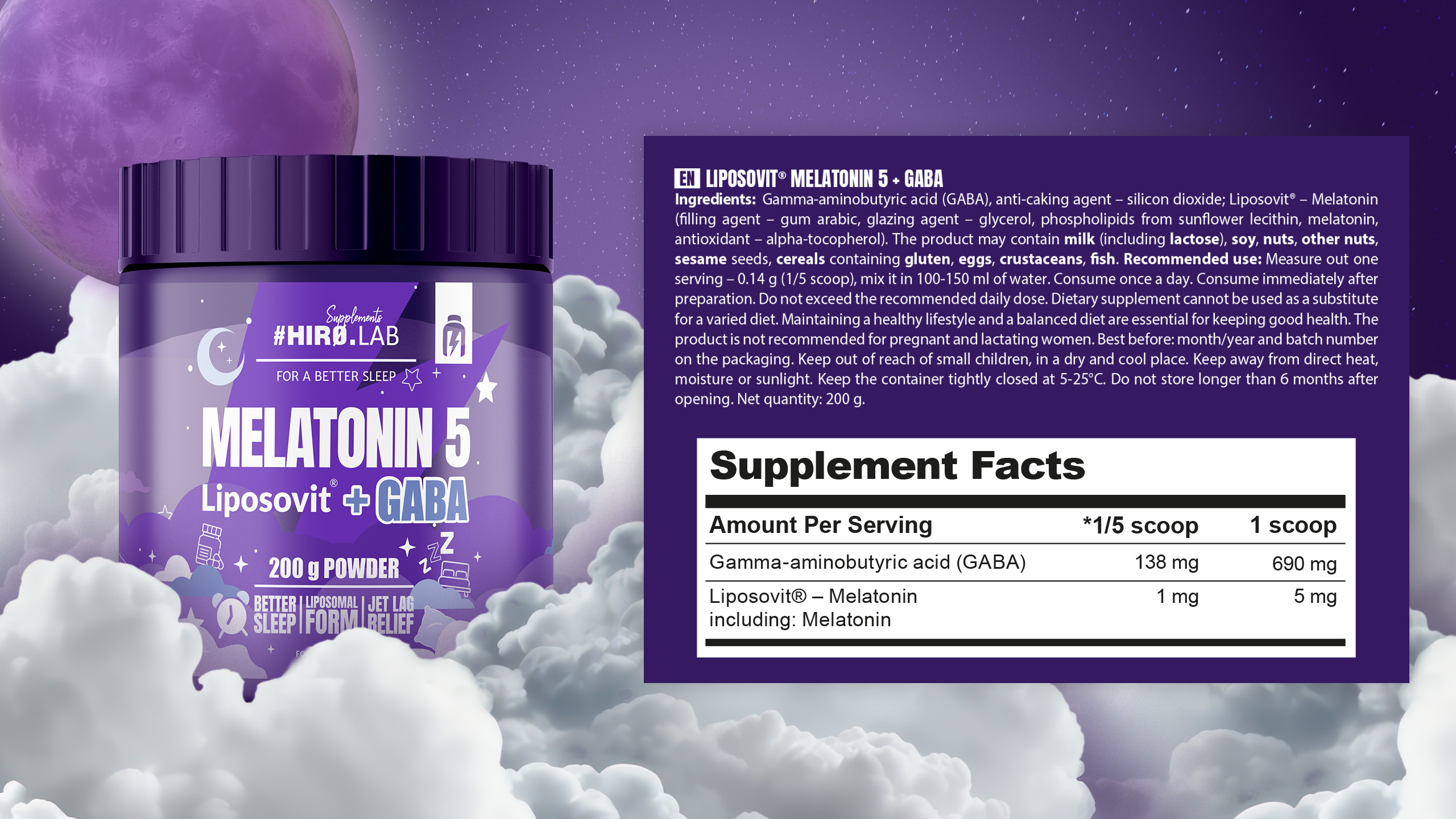- HIRO.LAB Melatonin 5 Liposovit + GABA 200 g unterstützt einen gesunden, erholsamen Schlaf und hilft, schneller einzuschlafen. Dank der liposomalen Formel und dem Zusatz von GABA lindert es Stress und Jetlag-Symptome.